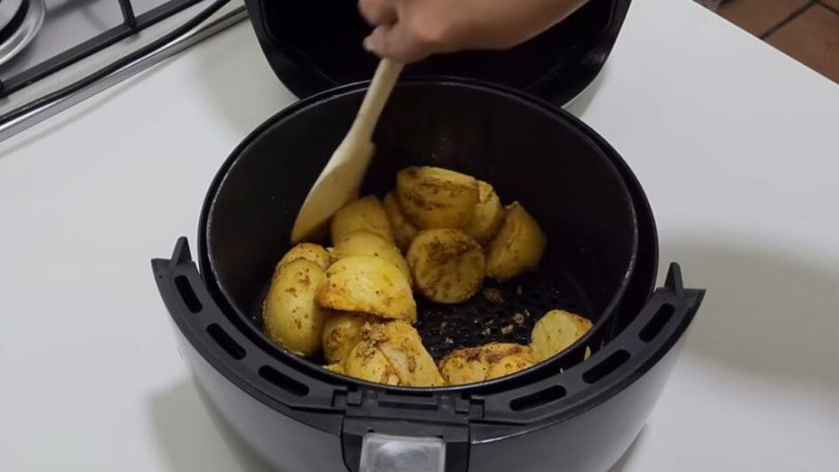 Agora, distribua as batatas em uma única camada para permitir circulação de ar. Cozinhe por 12 a 20 minutos, mexendo na metade do tempo, até ficarem douradas e crocantes por fora e macias por dentro. O tempo exato depende da espessura dos pedaços e do modelo da máquina.