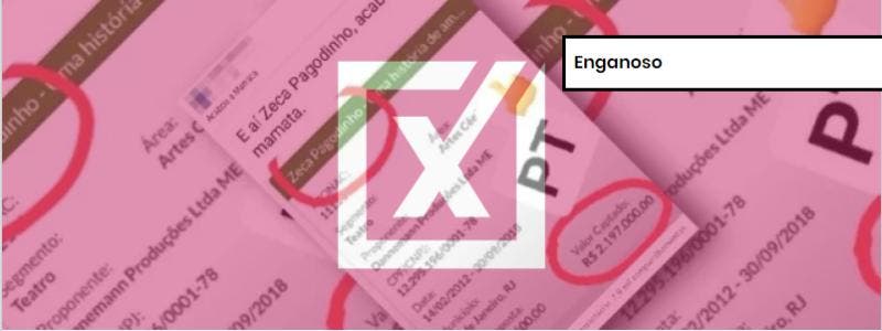 O Projeto Comprova classificou como enganoso um post que insinua que o cantor Zeca Pagodinho apoia o PT porque teria recebido milhões de reais captados por meio da Lei Rouanet. A postagem traz uma imagem com informações sobre o projeto “Zeca Pagodinho – Uma história de amor ao samba”, uma peça de teatro musical que recebeu o incentivo fiscal. O nome do cantor e o valor captado aparecem circulados. Mas Zeca não esteve envolvido diretamente com a produção, e tampouco declarou apoio ao PT abertamente, embora tenha uma relação amistosa com o ex-presidente Luiz Inácio Lula da Silva (PT).
