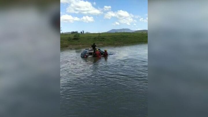 Jovem cai de carro no rio e espera socorro sentado no capô do veículo em SC