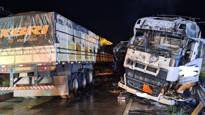 Cabine de carreta carregada com etanol pega fogo após colisão no Oeste de SC