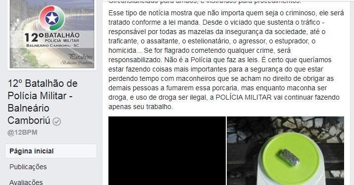 Página da PM faz desabafo em rede social após apreensão de 5 gramas de maconha em Balneário Camboriú
