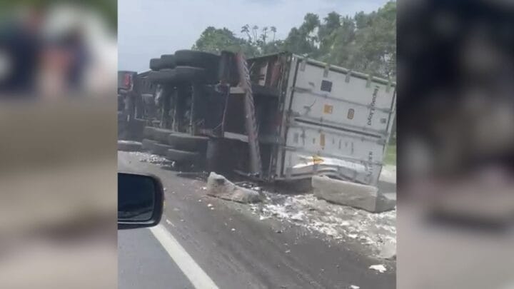 VÍDEO: Caminhão-baú tomba, bate em mureta e causa lentidão na BR-101 em Joinville